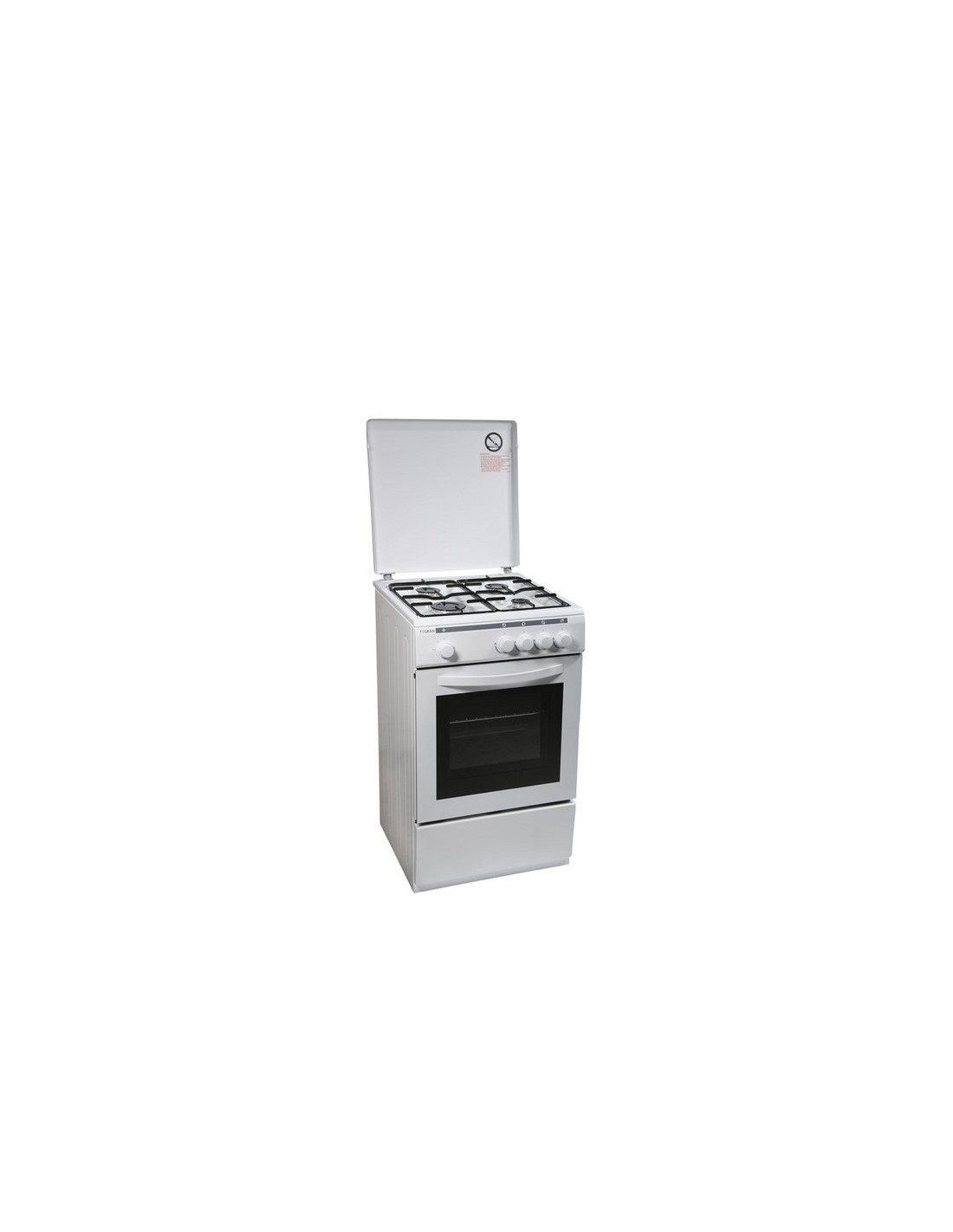 Cocina 4 fuegos a gas Horno a gas Color Blanco 1 Quemador Rápido, 2 Semi-Rápidos y 1 auxiliar Medidas 50x50 Válvula de seguridad, Gas Stop Tapa esmaltada 2 Parrillas cocina acero esmaltado Bandeja y parrilla en horno Doble cristal en puerta